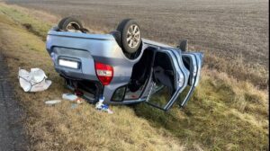 Auto skončilo v priekope vyvrátené na streche. Zranila sa jedna osoba