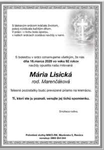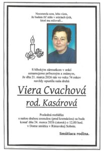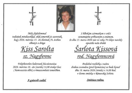 17.mar.2026 - Smútočné oznámenie, Šarlota Kissová, rod. Nagyferencová (†76) Ďalej...
