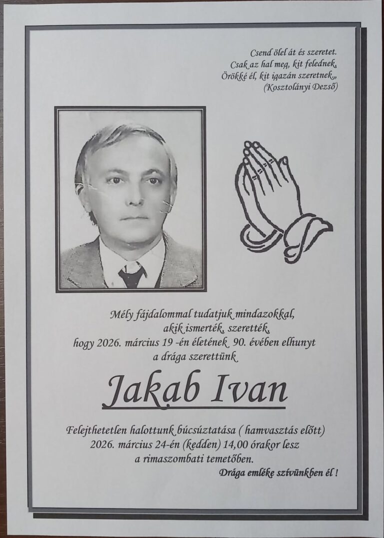 22.mar.2026 - Smútočné oznámenie, Jakab Ivan (†90) Ďalej...