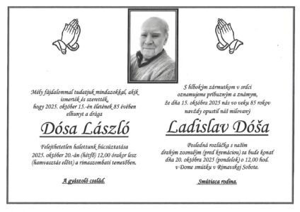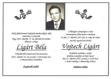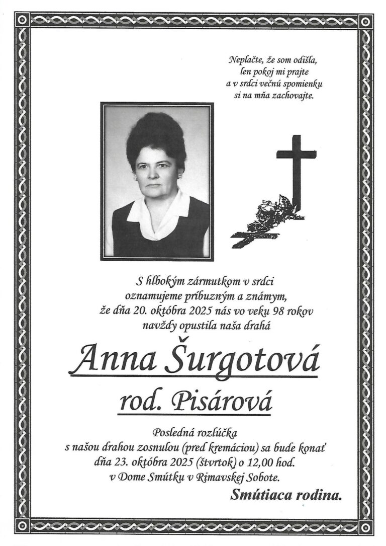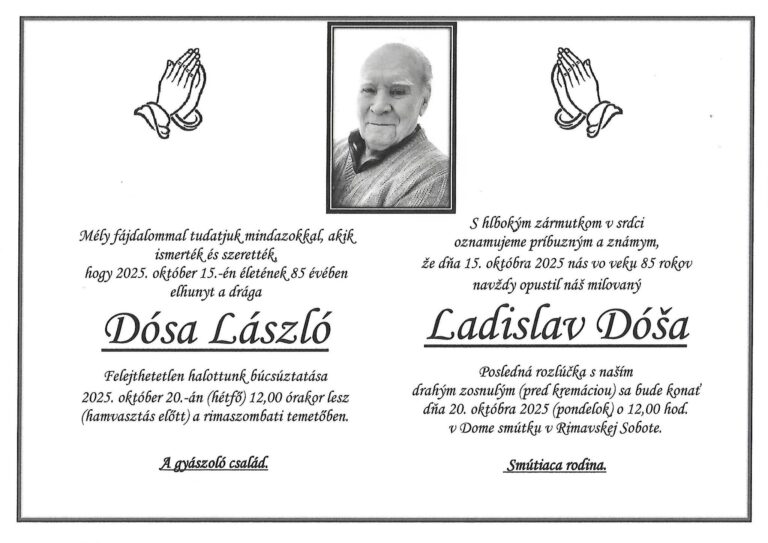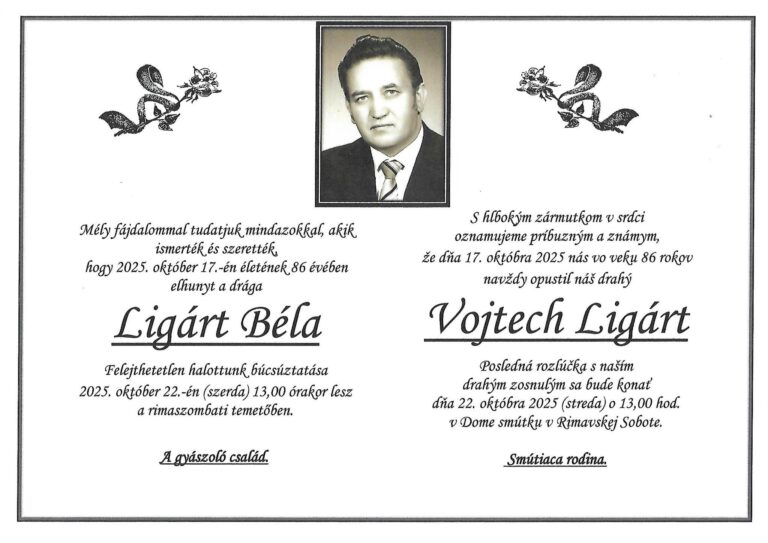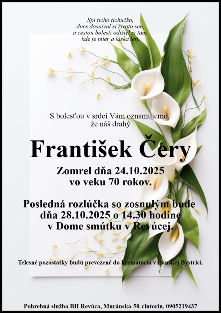 14.okt.2025 - S hlbokým zármutkom v srdci oznamujeme, že dňa 1.10.2025 nás navždyopustil milovaný manžel, otec, starý otec a priateľ Ing. Július Barič,narodený 23.8.1955, bytom Lehota nad Rimavicou. Posledná rozlúčka s našimdrahým zosnulým bude vo štvrtok 16.10.2025 o 15:00 v dome smútku vRimavských Zalužanoch. Smútiaca rodina. Ďalej...