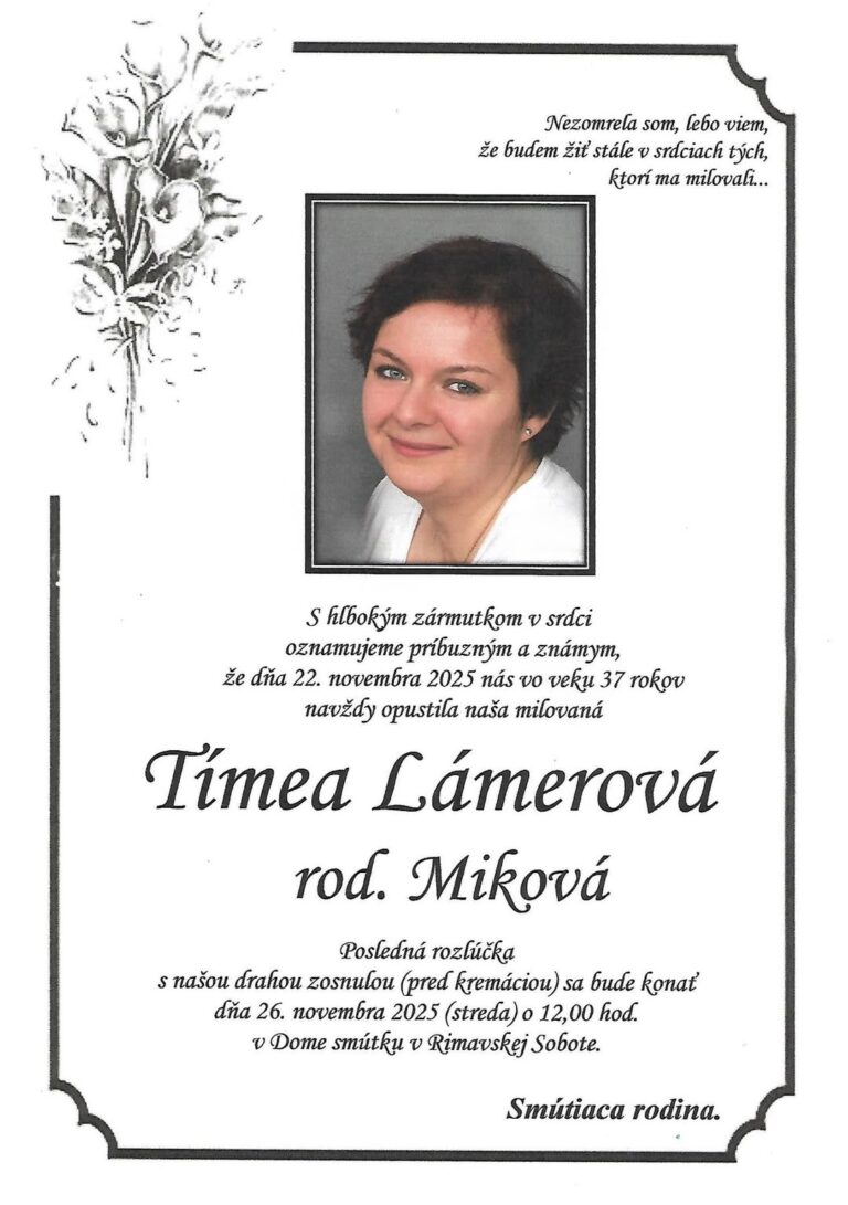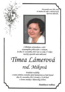 25.nov.2025 - Smútočné oznámenie, Tímea Lámerová, rod. Miková (†37) Ďalej...