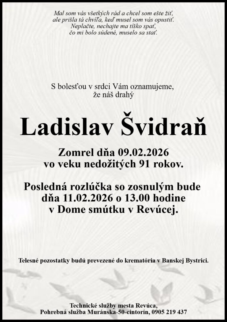 10.feb.2026 - Smútočné oznámenie, Ladislav Švidraň (†91) Ďalej...