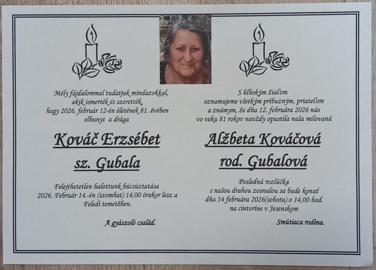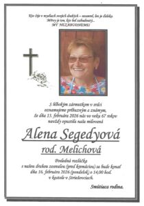 14.feb.2026 - Smútočné oznámenie, Alena Segedyová, rod. Melichová (†67) Ďalej...