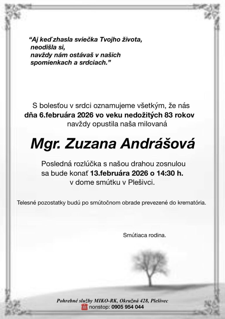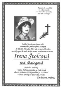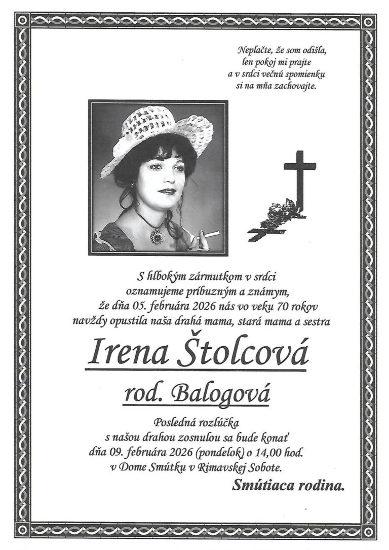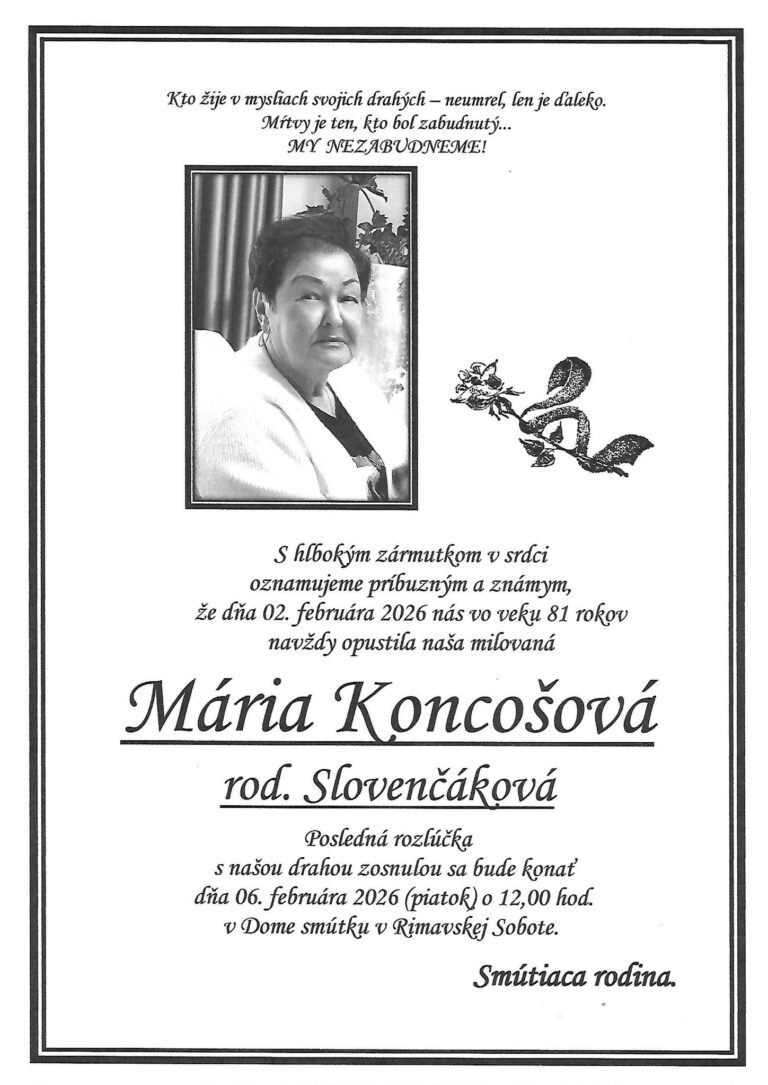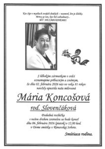 4.feb.2026 - Smútočné oznámenie, Mária Koncošová, rod. Slovenčáková (†81) Ďalej...