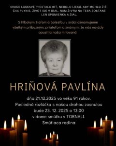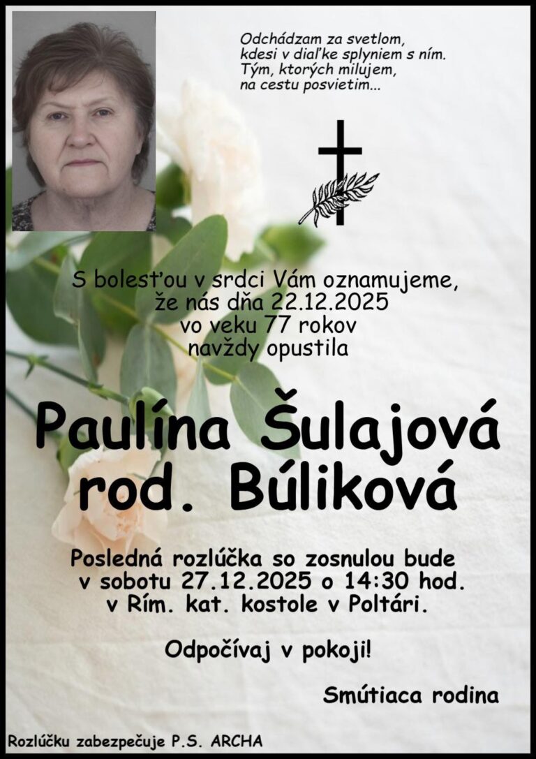 25.dec.2025 - Smútočné oznámenie, Paulína Šulajová, rod. Búliková (†77) Ďalej...
