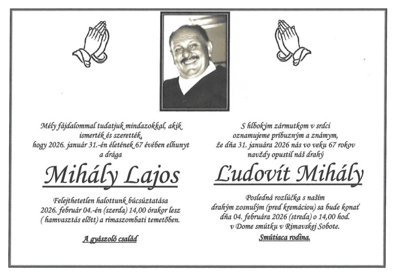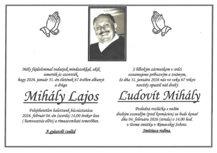 3.feb.2026 - Smútočné oznámenie, Ľudovít Mihály (†67) Ďalej...
