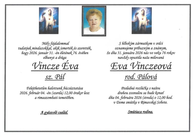 3.feb.2026 - Smútočné oznámenie, Eva Vinczeová, rod. Pálová (†76) Ďalej...