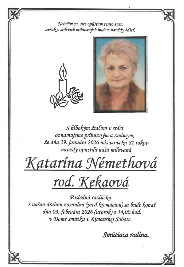 3.feb.2026 - Smútočné oznámenie, Katarína Némethová, rod. Kekaová (†81) Ďalej...