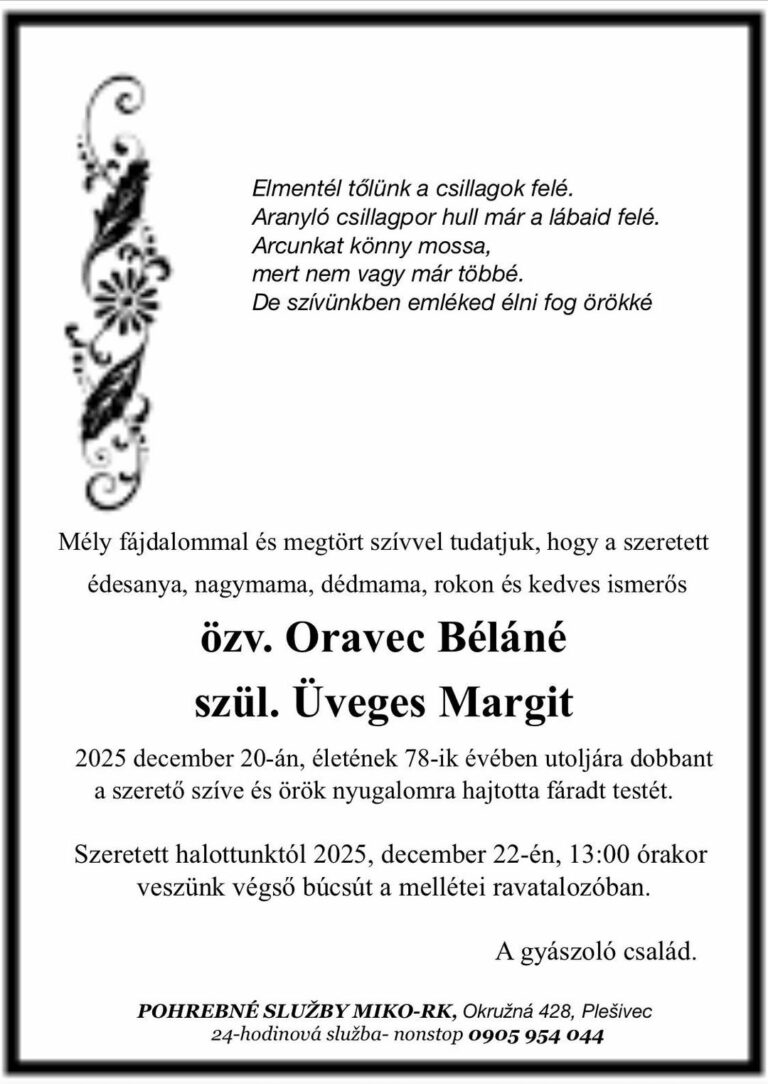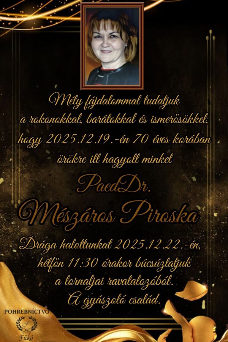 14.dec.2025 - Smútočné oznámenie, Dusza Magdolna, rod. Micski (†93) Ďalej...