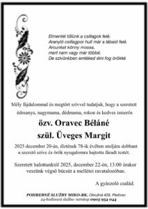 9.dec.2025 - Smútočné oznámenie, Komlósi Edit, rod. Bosnyák (†79) Ďalej...
