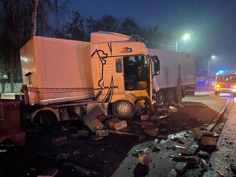 FOTO: Hasiči zasahovali pri nehode kamióna. Vodič narazil do oplotenia obecného úradu