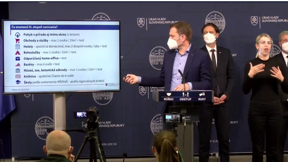 Podľa predsedu vlády Eduarda Hegera bola Veľká noc rozhodujúca. Napriek sviatkom podľa neho počet hospitalizovaných klesá. „Vieme, že momentálne dostupná zbraň, ktorú má každý z nás, je v interiéri respirátor a v exteriéri rúško,“ povedal Eduard Heger.