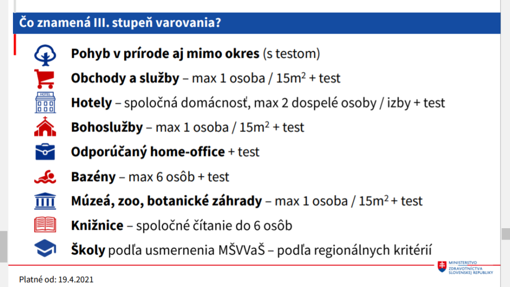 Od pondelka sa otvoria aj kostoly, pričom musí byť opäť dodržané pravidlo 15 metrov štvorcových na jednu osobu a povinný test na covid-19. Bude povolený taktiež šport v exteriéri pre maximálne 6 osôb, všetci musia mať negatívny test na koronavírus. Otvoria sa aj zoologické záhrady, botanické záhrady, múzea – platí pravidlo jedna osoba na 15 metrov štvorcových. Sprístupnené budú aj knižnice pre maximálne 6 osôb v jednom okamihu. Hotely a penzióny môžu tiež otvoriť – platia pravidlá spoločná domácnosť, max. 2 dospelé osoby na izbe a negatívny test, reštaurácie ostávajú zatvorené.