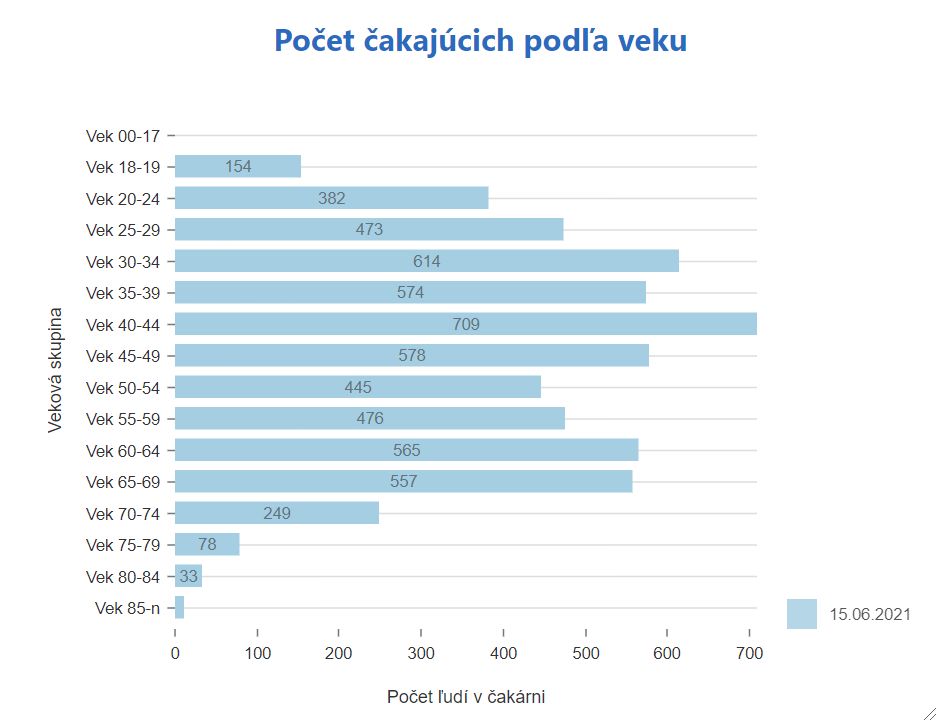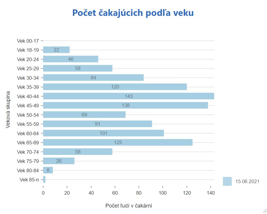 Z celoslovenského pohľadu je najviac ľudí čakajúcich na ruskú vakcínu vo veku 40 až 44 rokov (709). Väčšiu skupinu záujemcov tvoria aj 45 až 49-roční ľudia, tých je aktuálne v čakárni 578. O niečo menej, 574 ľudí, je vo veku 35 až 39 rokov.
