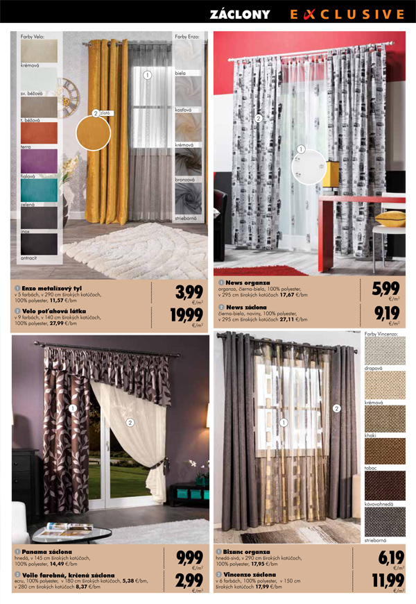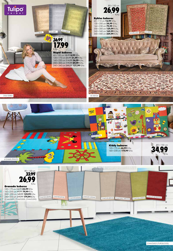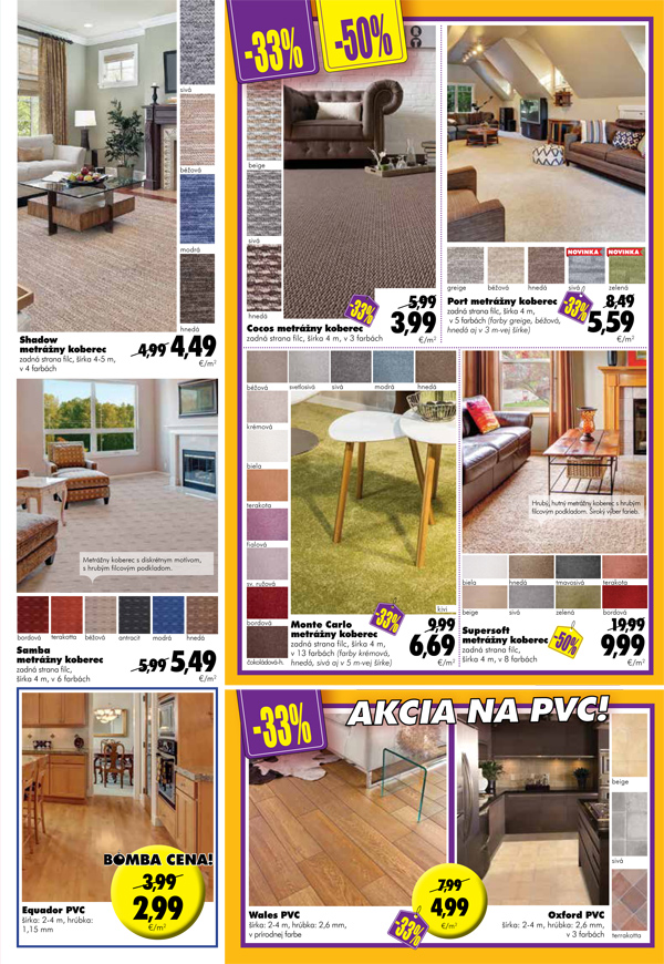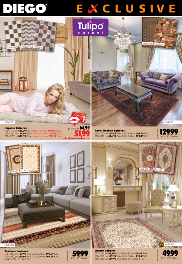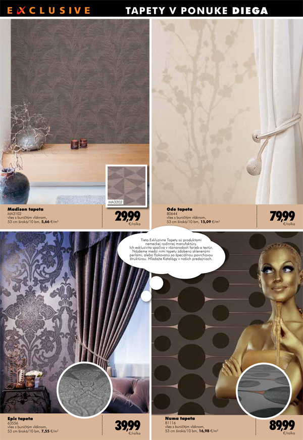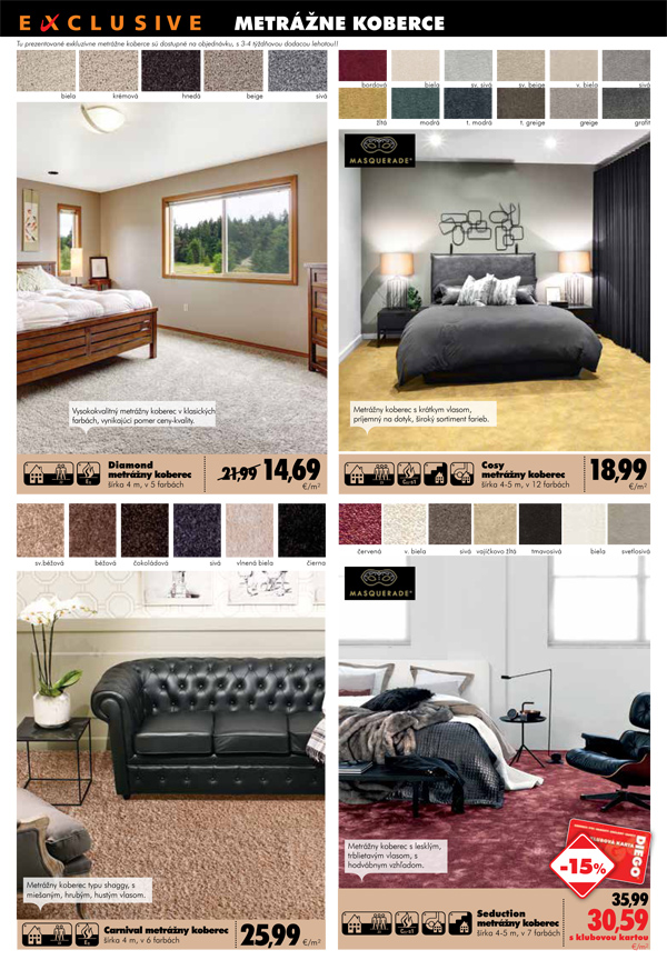 Vybrať si môžete aj krásne farebné koberce tiež v akciových cenách. Pozrite si aj novinku DIEGO, sériu produktov Exclusive. Nájdete tu exkluzívne metrážne koberce, špeciálne tapety od rodinnej manufaktúry z Nemecka, ako aj záclony a koberce s pocitom luxusu.