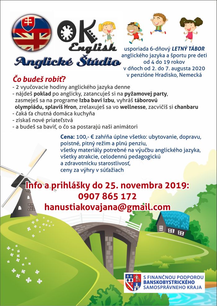 Začiatkom augusta 2020 usporiadame 6-dňový tábor anglického jazyka a športu pre deti vo veku 4-19 rokov v obci Nemecká pod stálym profesionálnym pedagogickým a zdravotníckym dozorom.