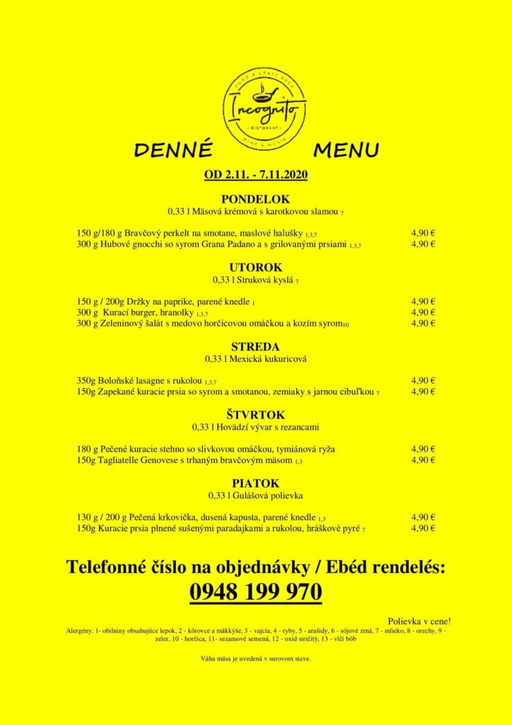 „Od štvrtka sme spustili donášku obedov priamo k zákazníkom. Každý si tak môže naďalej vychutnať jedlá, ktoré si u nás obľúbil. A aby mohli zákazníci objavovať aj nové chute, pripravili sme pre nich aj obnovený jedálny lístok. Objednávky na jedlá prijímame telefonicky na čísle 0948 199 970 denne od 8.00 do 20.00 hodiny, rozvoz funguje do 21:00. Objednať si môžete denné menu, ako aj jedlá z nášho jedálneho lístka. Jedlo si samozrejme môžete zobrať aj priamo od nás z reštaurácie. Balíme ho v moderných baliacich materiáloch, ktoré sú hygienické a navyše vám z nich cestou nič nevykvapká.“, predstavuje aktuálne zmeny majiteľ Incognito Bistorant, Bálint Takács.