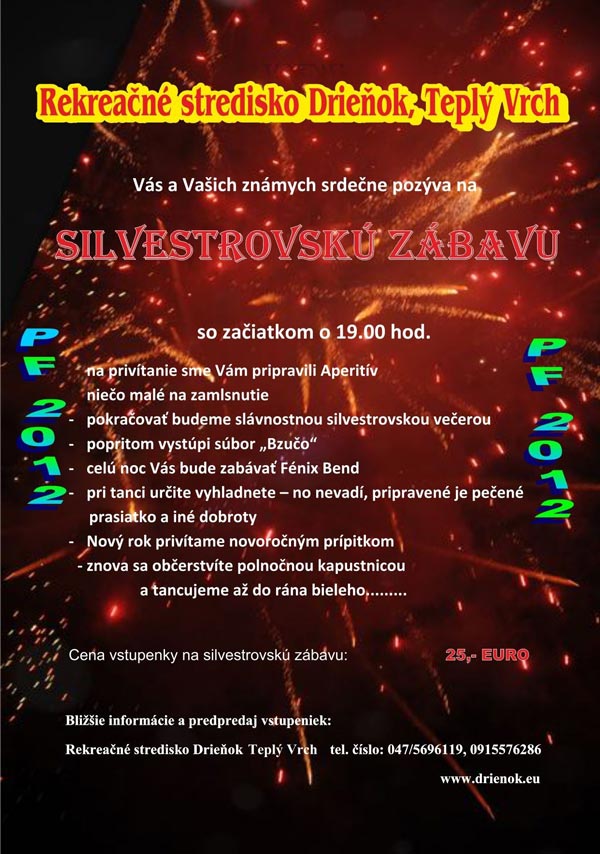 Rozlúčka so starým rokom sa začína o 19.00 hod, pre hostí je pripravený aperitív, slávnostná silvestrovská večera aj vystúpenie súboru Bzučo. Celú noc bude do tanca hrať Fénix Bend, kto na parkete vyhladne, môže si pochutnať na pečenom prasiatku a iných dobrotách. Po novoročnom prípitku príde na rad aj polnočná kapustnica a tancovať sa môže ďalej, až do rána bieleho...