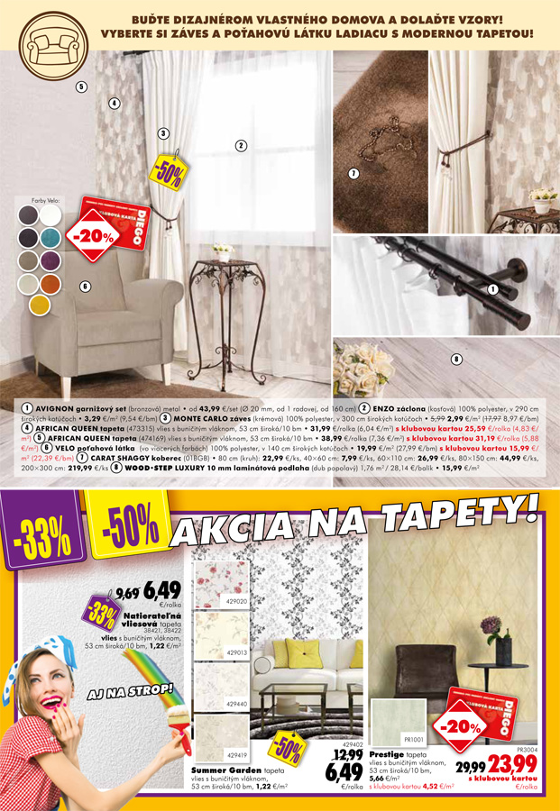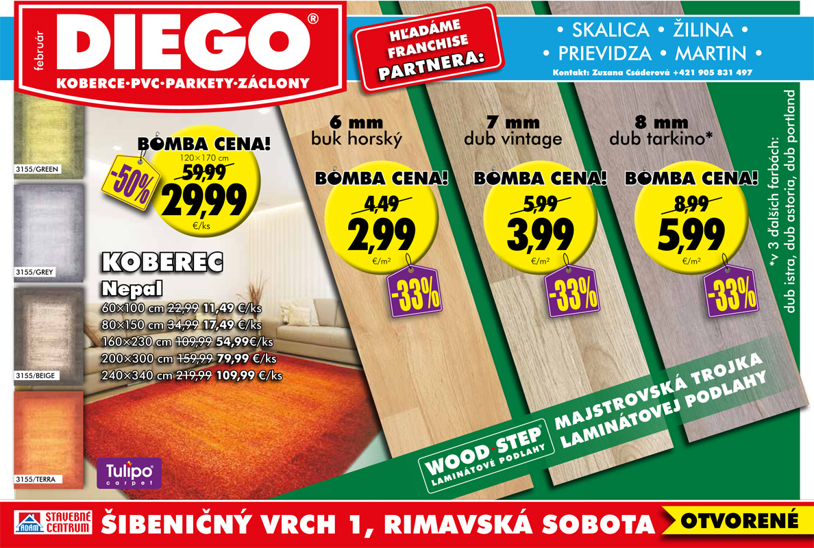 Pozrite si februárovú akciovú ponuku predajni DIEGO v Rimavskej Sobote. V ponuke nájdete laminátové podlahy za neskutočne nízke ceny, už od 2,99€/m2, ale aj akcie na veľký výber kobercov, tapiet aj záclon.
