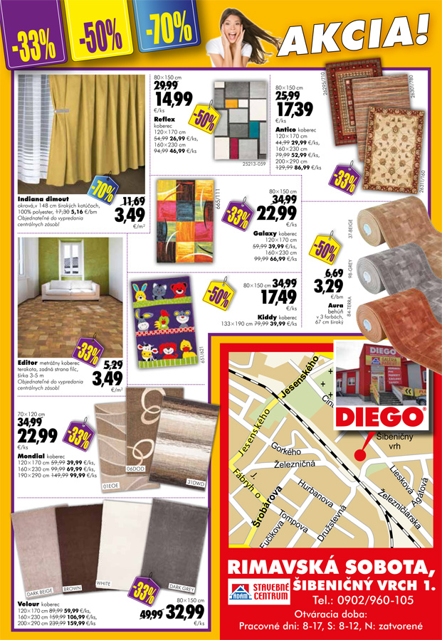 Predajňu Diego nájdete v areáli Stavebnín Ádám na Šibeničnom vrchu č. 1 v Rimavskej Sobote. Otváracia doba: pondelok-piatok od 8:00 do 17:00, v sobotu od 8:00 do 12:00.