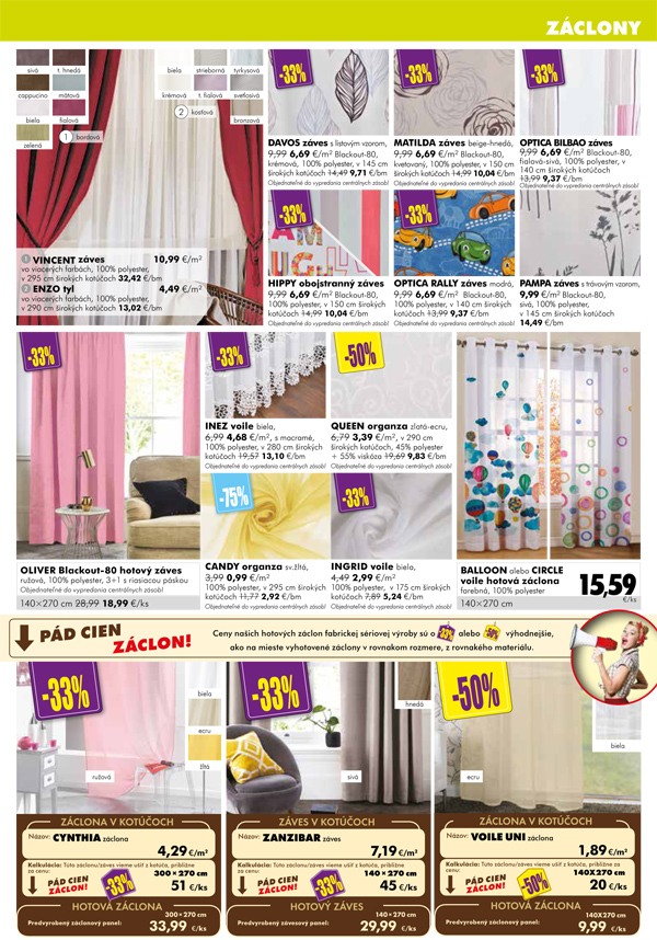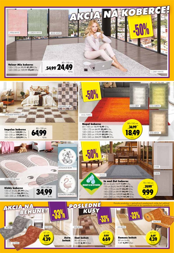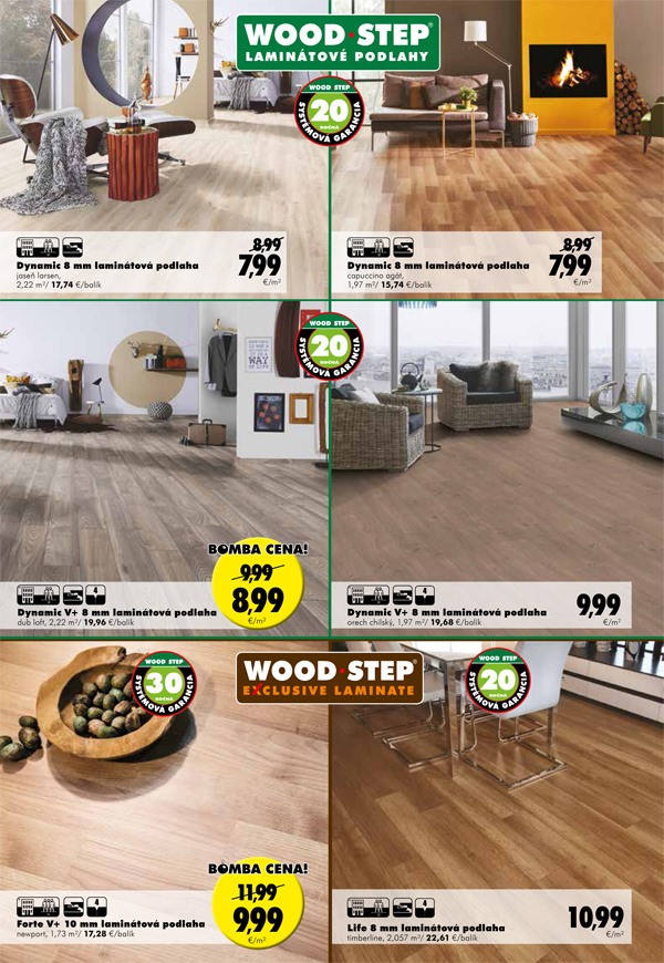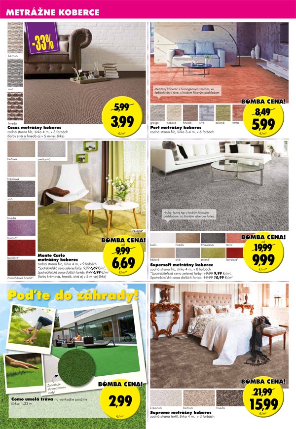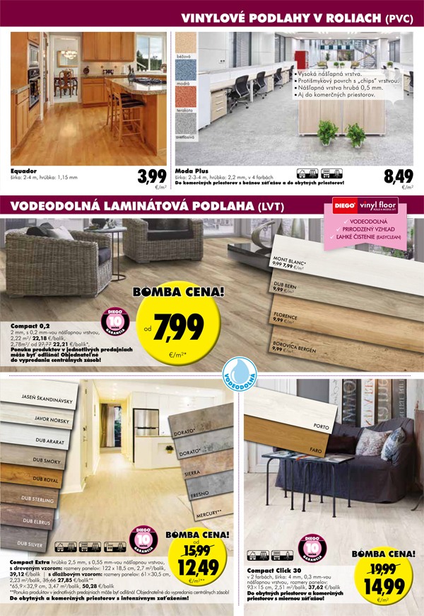 Tentokrát nájdete v ponuke medzi inými napríklad vinylové podlahy v šírke 2-3-4 metre za bomba cenu 4,99 €/m2. Pripravili pre vás aj osobitnú ponuku laminátových podláh, vrátane vodeodolných, za výnimočné ceny. Okrem toho vás čakajú aj 30-50% zľavy aj na vybrané koberce, záclony, alebo tapety.