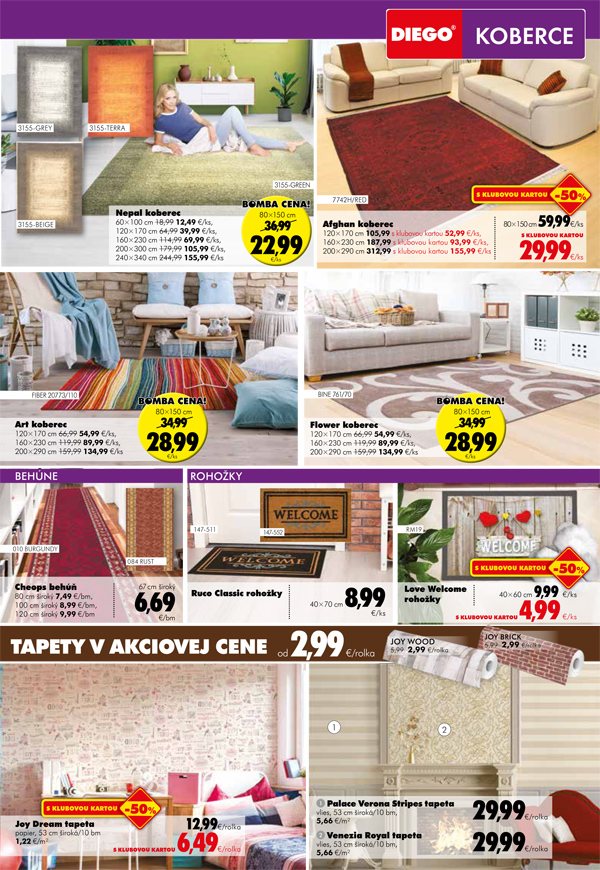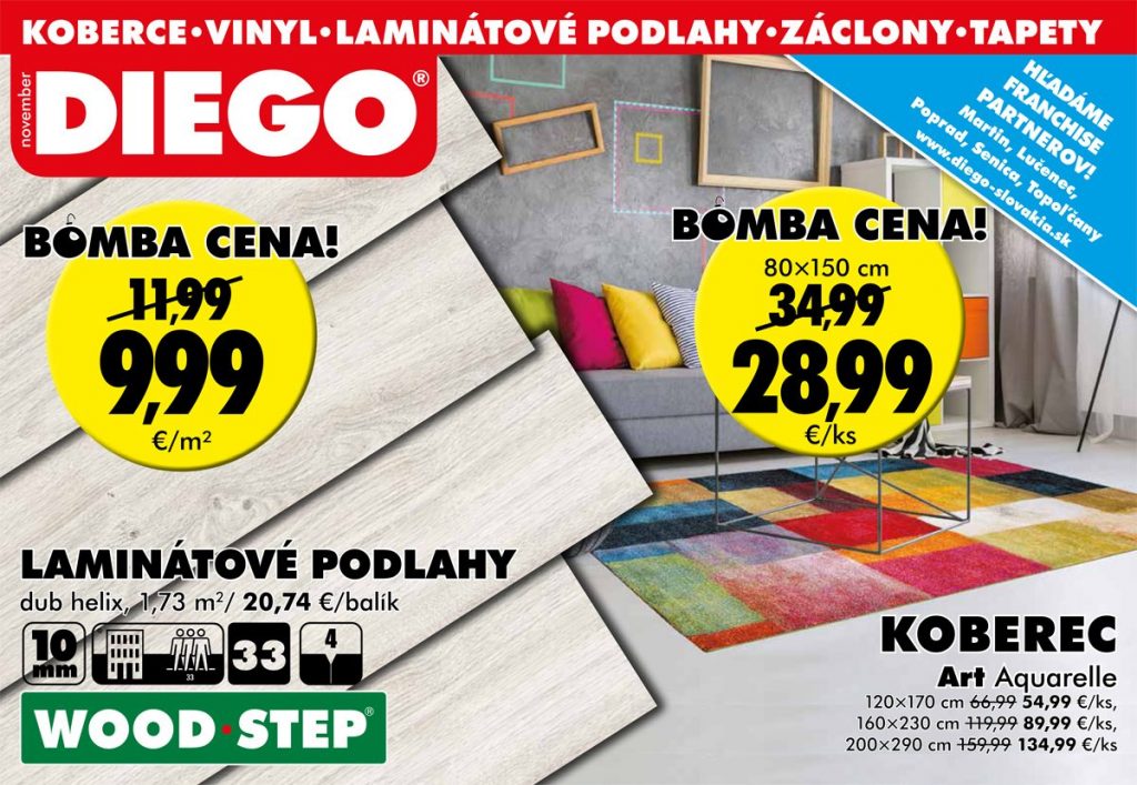 November v rimavskosobotskej predajni DIEGO vás čaká s až 50% zľavami na záclony a koberce. A ako vždy, aj teraz nájdete laminátové a vinylové podlahy v rôznych štýloch za bomba ceny. A ak máte aj klubovú kartu DIEGO, čaká vás toho ešte výrazne viac!