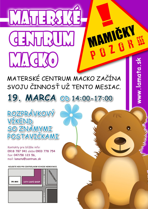 Materské centrum Macko začína svoju činnosť už tento mesiac. V sobotu, 19. marca od 14-tej do 17-tej hodiny je pre deti a ich rodičov pripravený Rozprávkový víkend so známymi postavičkami. O týždeň neskôr, v sobotu, 26. marca, sa uskutoční prvá zo série odborných prednášok, témou bude Výživa detí a správny jedálny lístok.