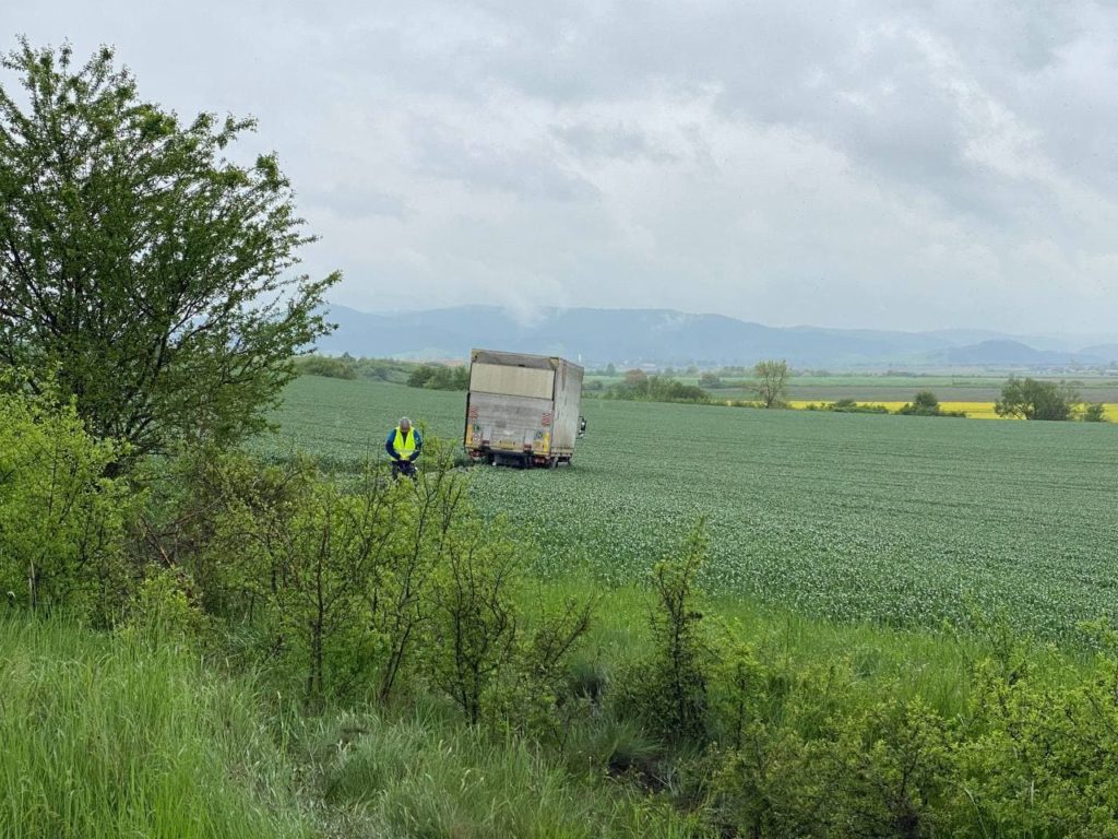 PAVLOVCE – Ďaleko v poli od cesty skončil jeden z dvoch kamiónov, ktoré do seba narazili na komunikácii II/571 za Pavlovcami pri Rimavskej Sobote. Po kontakte bočnými časťami nákladných vozidiel vodič jedného z nich, zrejme v snahe vyhnúť sa kolízii, zišiel mimo cesty.