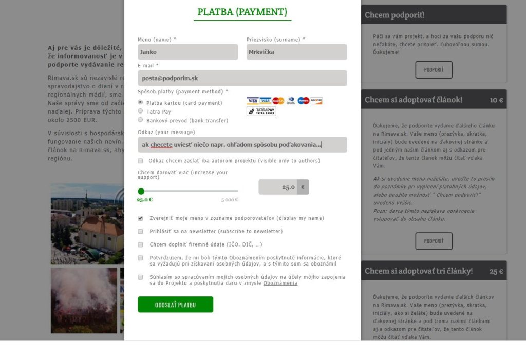 3. Vyplňte platobné údaje, vyberte preferovaný spôsob platby. Napíšte nám odkaz (napr. ak nechcete uvádzať celé meno pri článkoch, alebo len skratku, iniciály, krstné meno a podobne, alebo ľubovoľný iný odkaz, ktorý nám chcete poslať). Prednastavenú sumu môžete ľubovoľne zvýšiť, ak by ste chceli darovať viac, než je to prednastavené. Na záver kliknite na "odoslať platbu".