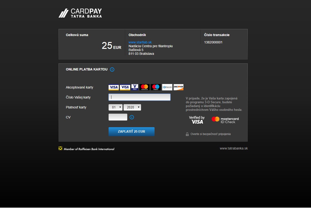4. Budete presmerovaný na platobnú bránu (ak ste si vybrali možnosť platby kartou), alebo na stránku s platobnými údajmi (ak ste zvolili možnosť platby prevodom). Následne dostanete potvrdenie v emaily. Ak sa do 30.5.2020 nenazbiera cieľová suma 2500 EUR, peniaze vám budú vrátené na váš účet.
