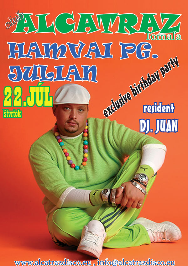 Disco-club Alcatraz v Tornali na dnes večer (22. júla) pripravil exkluzívnu narodeninovú párty. Vstupenky na HAMVAI PG. si môžte zakúpiť v Alcatraz clube alebo v ŠPORT bare v predpredaji za výhodnú cenu iba 3,-EUR.
