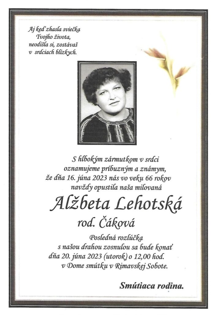 Smútočné oznámenie - Alžbeta Lehotská (†66)