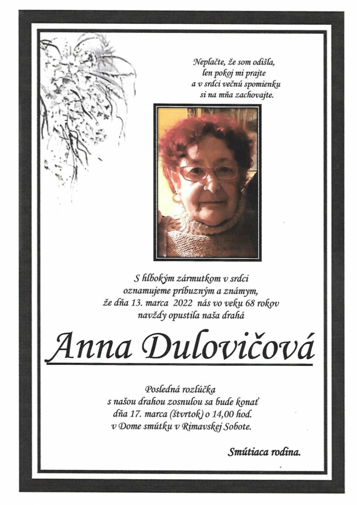 Smútočné oznámenie – Anna Dulovičová (†68)