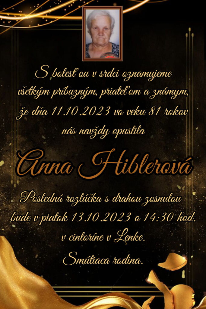 Smútočné oznámenie - Anna Hiblerová (†81)