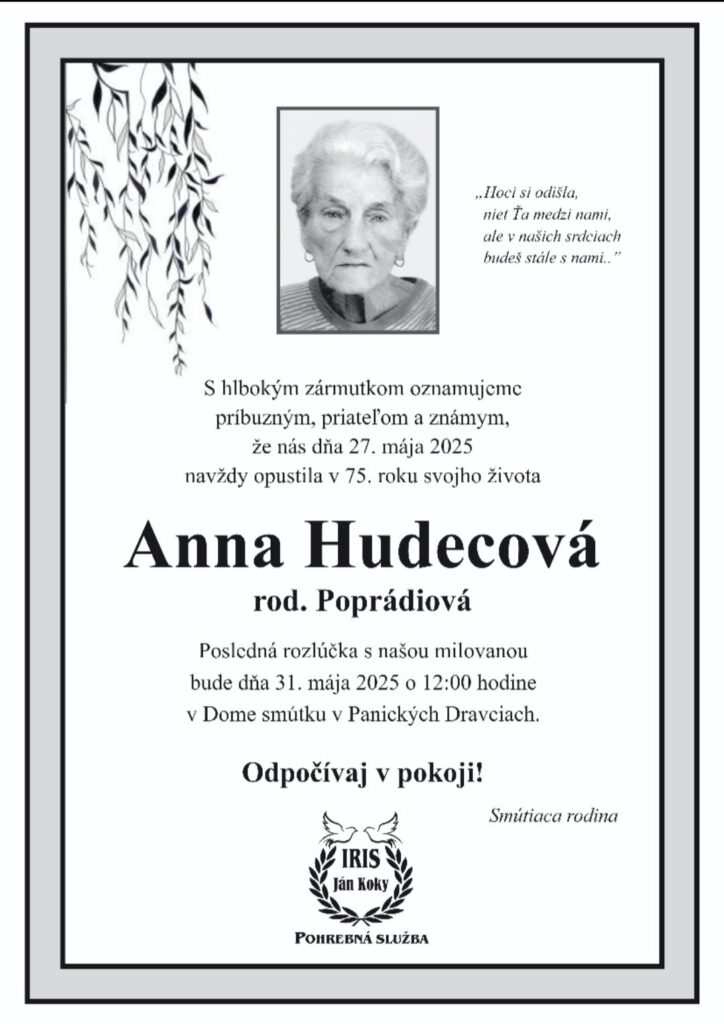 Smútočné oznámenie, Anna Hudecová, rod. Poprádiová (†75)