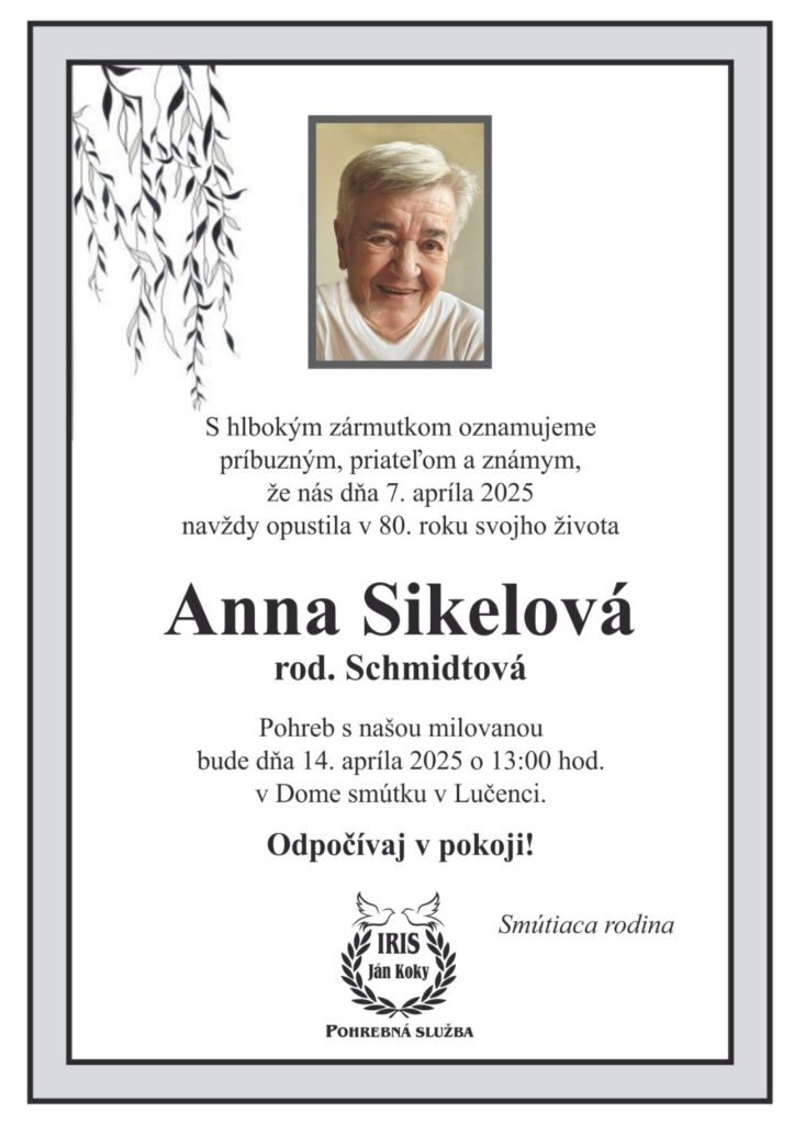 Smútočné oznámenie, Anna Sikelová, rod. Schmidtová (†80)