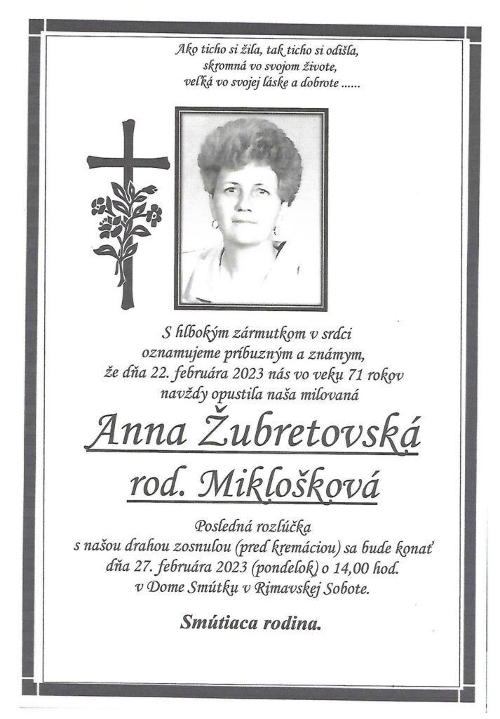 Smútočné oznámenie - Anna Žubretovská (†71)