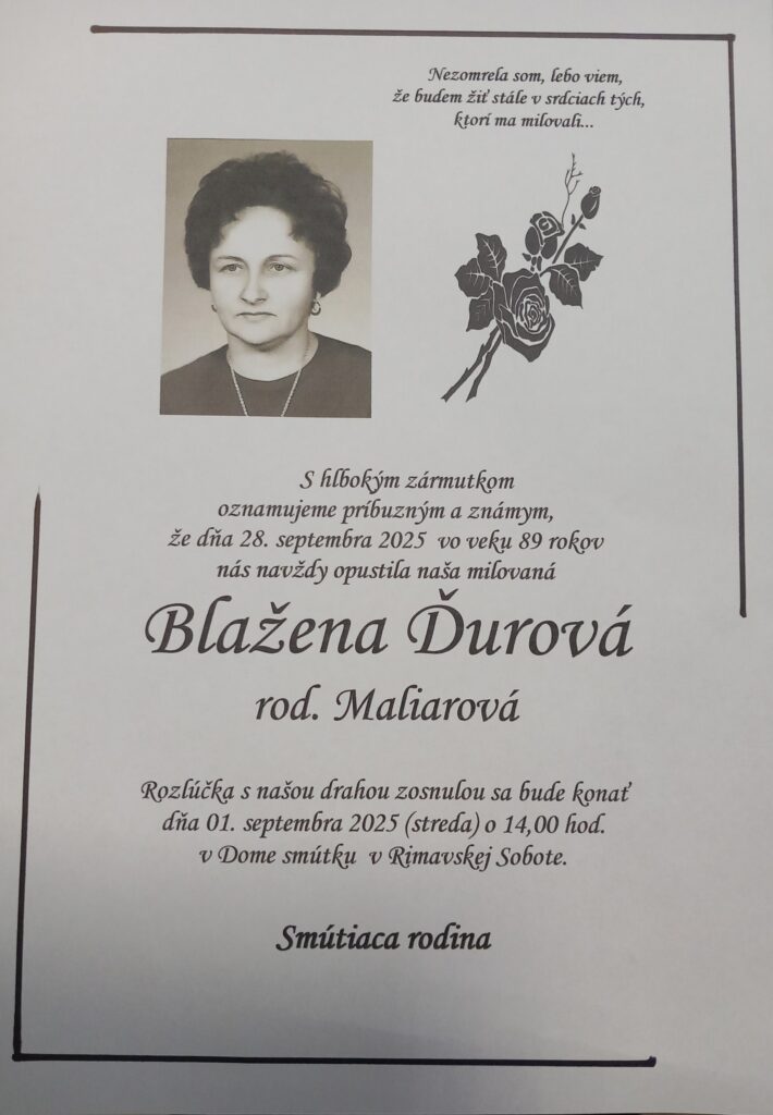Smútočné oznámenie, Blažena Ďurová, rod. Maliarová (†89)