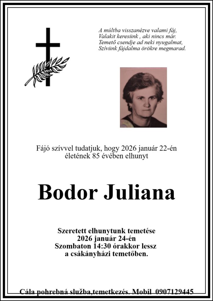 Smútočné oznámenie, Bodor Juliana (†85)