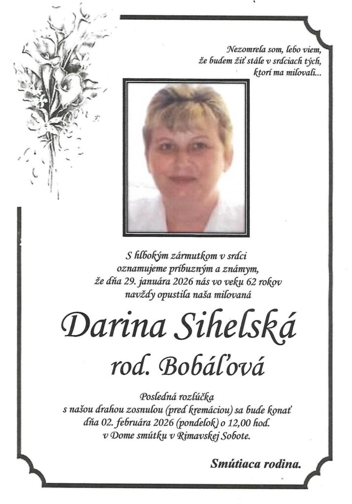Smútočné oznámenie, Darina Sihelská rod. Bobáľová (†62)