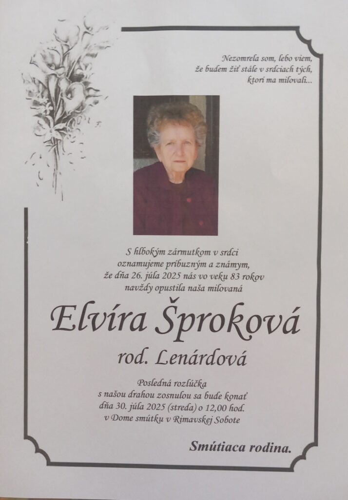 Smútočné oznámenie, Elvíra Šproková, rod. Lenárdová (†83)