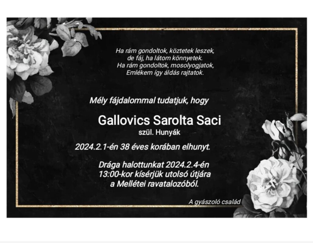Smútočné oznámenie - Gallovics Sarlota Saci (†38)