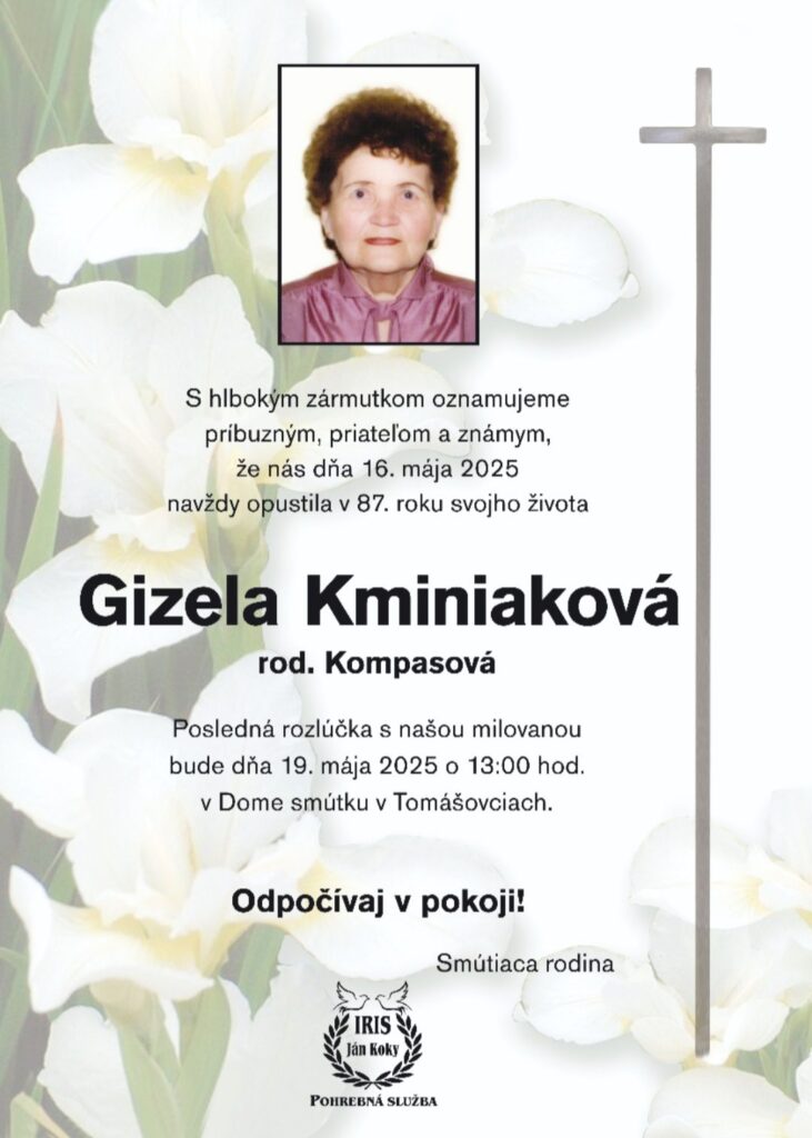Smútočné oznámenie, Gizela Kminiaková, rod. Kompasová (†87)