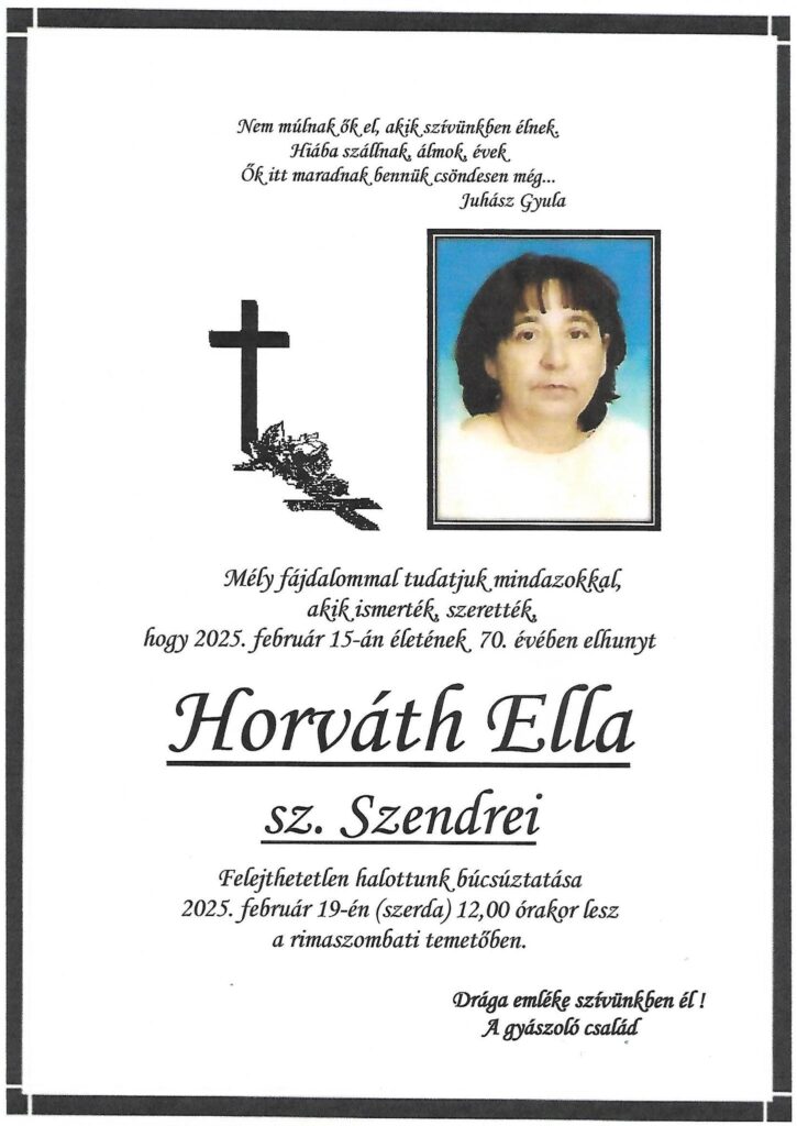 Smútočné oznámenie, Horváth Ella, rod. Szendrei (†70)
