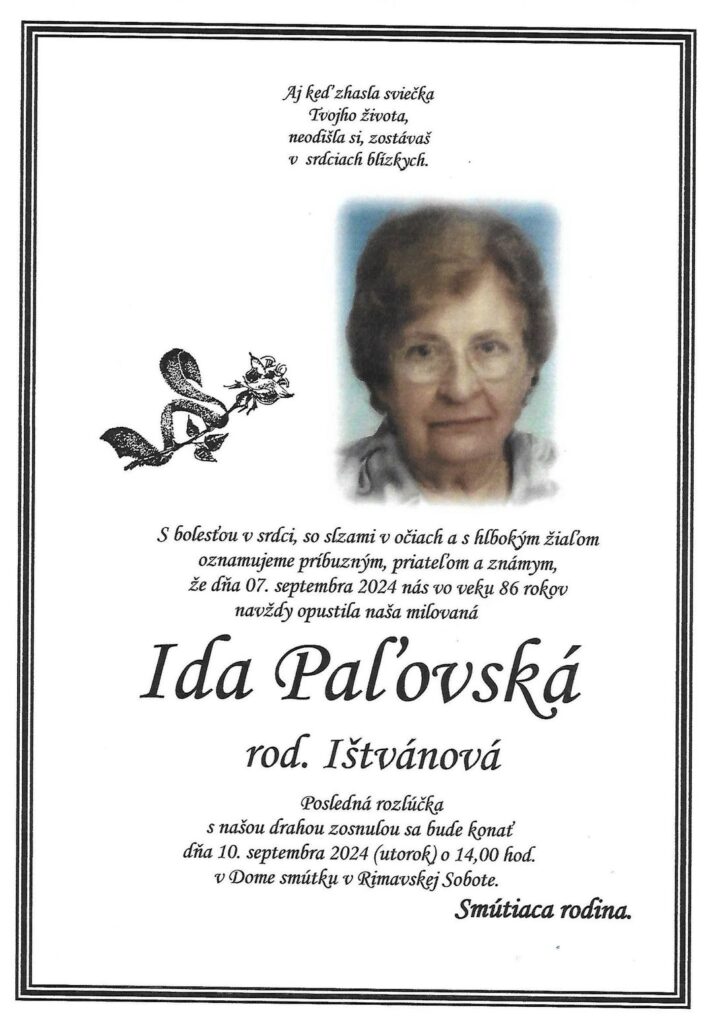 Smútočné oznámenie, Ida Paľovská rod. Ištvánová († 86)