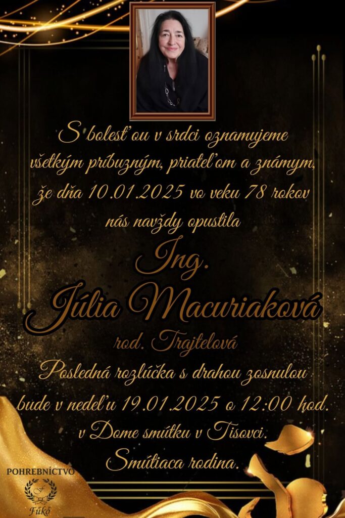 Smútočné oznámenie, Ing. Júlia Macuriaková, rod. Trajtelová (†78)