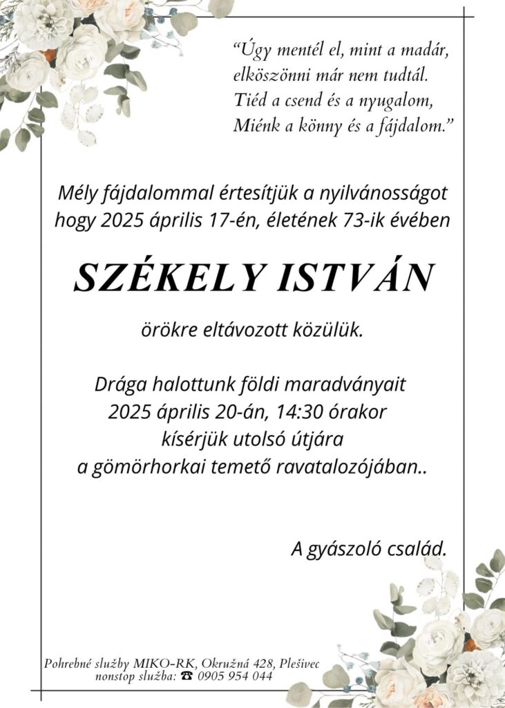 Smútočné oznámenie, István Székely (†73)