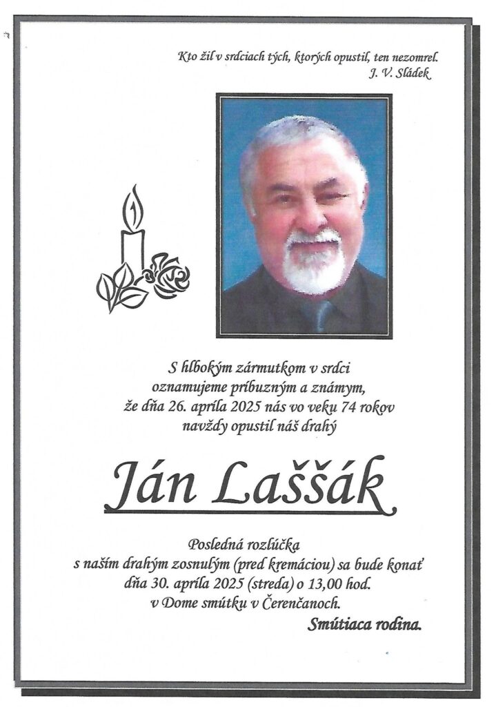 Smútočné oznámenie, Ján Laššák (†74)