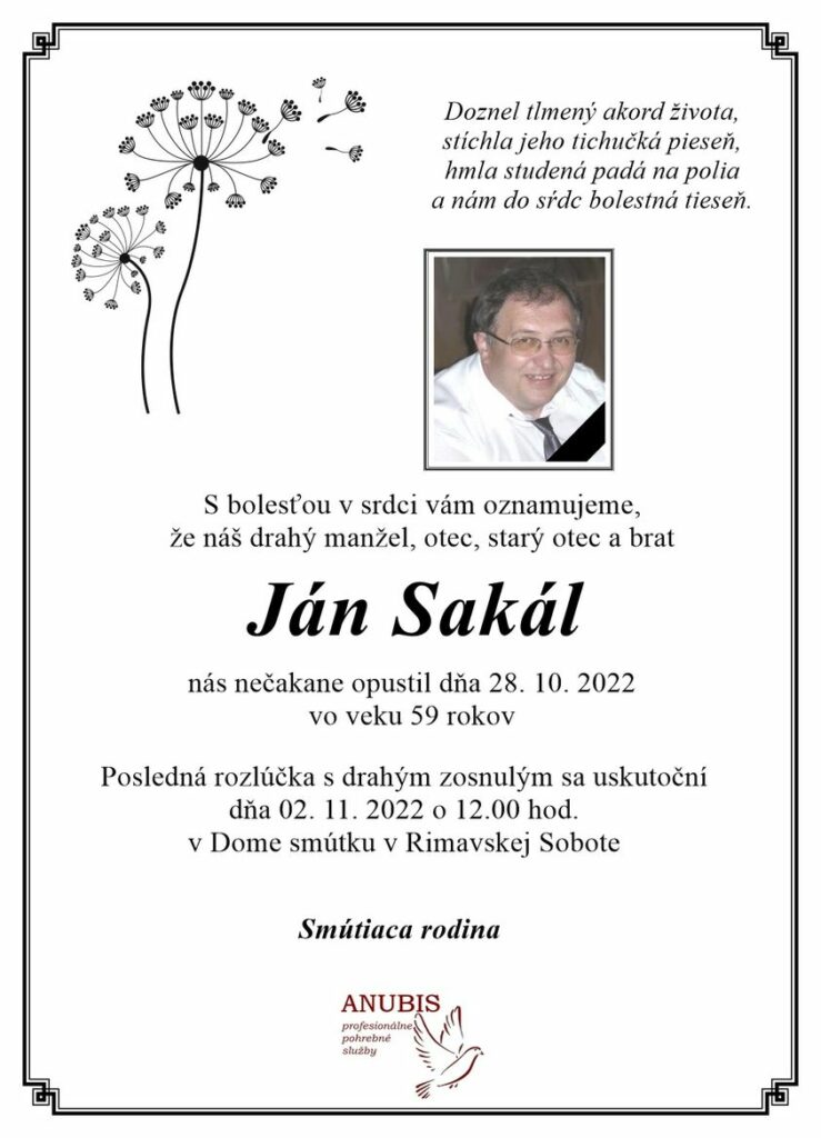 Smútočné oznámenie - Ján Sakál (†59)