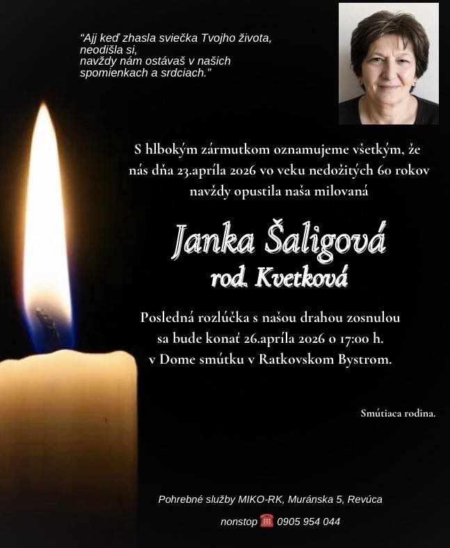 Smútočné oznámenie, Janka Šaligová rod. Kvetková (†60)